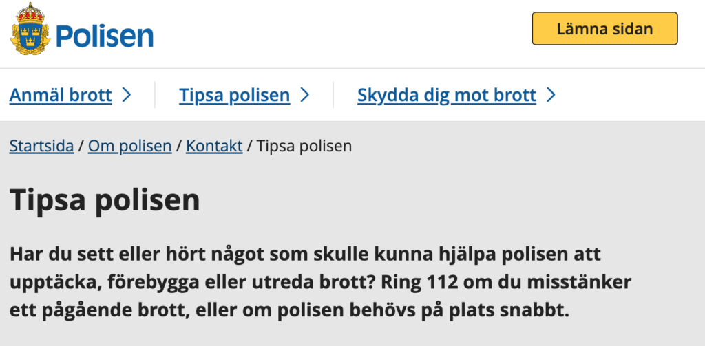 Man kan tipsa polisen om misstänkt brottslighet på polisens hemsida, polisen.se. Eller ringa 11414. Den som vill vara anonym kan vara det. Polisen tar gärna emot tips om misstänkt brottslig verksamhet. Pågående brott ska alltid anmälas direkt till 112.