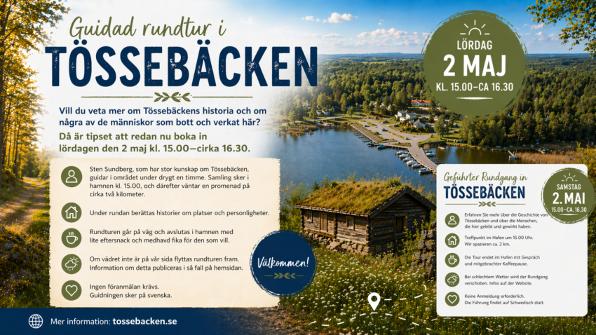 Möchten Sie mehr über die Geschichte von Tössebäcken und über einige der Menschen erfahren, die hier gelebt und gearbeitet haben? Dann merken Sie sich schon jetzt Samstag, den 2. Mai, von 15:00 bis etwa 16:00 Uhr.